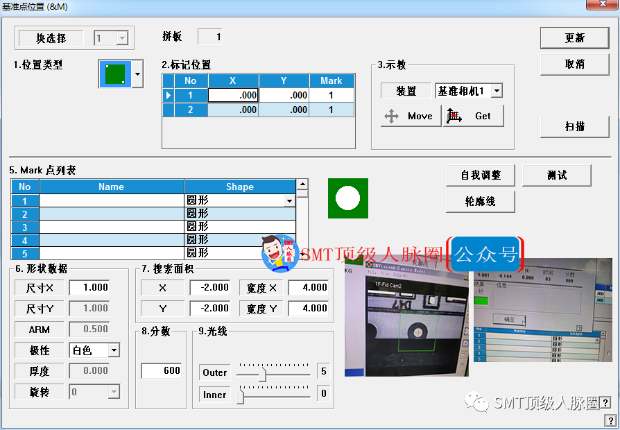 5.設置mark基準點(一般選對角的點來設,選擇圓形,用示教盒移動到點中心,調整亮度,然后點自我調整就行,然后測試得到XY數據,做完點更新)