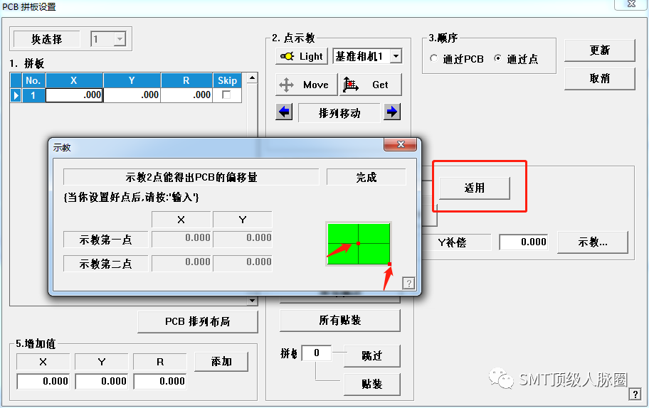 6.做拼板,我這板現在是20拼,所以輸入的是1×20(1是左右拼板數,20是上下拼板數),找[敏感詞]條板右下角的一個焊盤(選擇直角)得到[敏感詞]條拼板的XY坐標,然后示教輸入[敏感詞]條拼板的坐標,輸入完[敏感詞]條拼板的坐標后用示教盒移動到第二條拼板的同樣焊盤位置再輸入,然后完成點適用,如有偏差,有手動校正一下全部拼板。做完點更新。